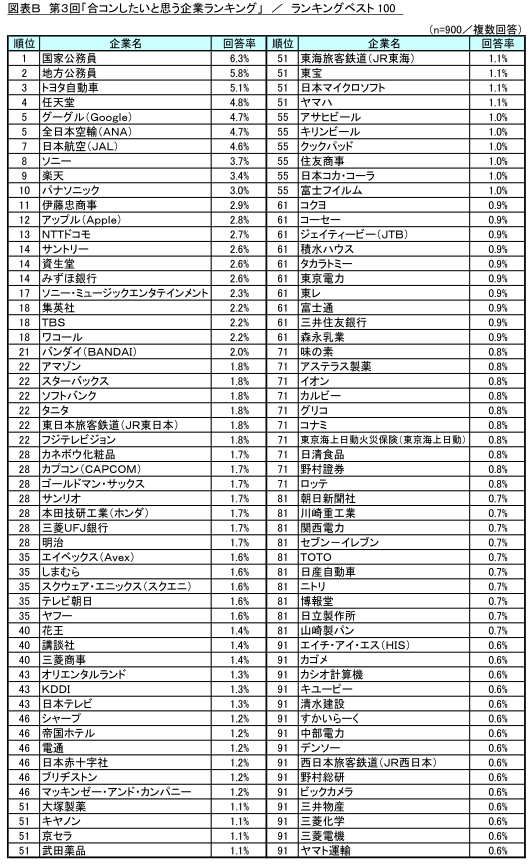 調査結果発表:リスモン調べ~第3回「合コンしたいと思う企業ランキング」調査~製造業が人気!あなたの会社は何位にランクイン?