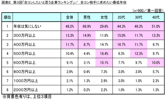 男女別では、男性の70%近くは「年収は気にしない」(回答率66.9%)と回答する一方で、女性は「年収は気にしない」(回答率29.6%)割合は30%程度でした。また、合コン相手に求めたい最低年収として、500万円以上とする男性の割合(合計回答率9.4%)は10%未満であるのに対し、女性の割合(同43.9%)は40%以上でした。日本における平均年収が432万円(平成29年民間給与実態統計調査より)であることを考慮すると、女性は合コン相手に平均年収以上を求める傾向がうかがえます。(図表E)
