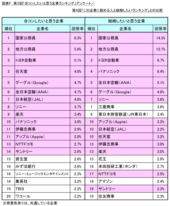合コンに参加する人の80%以上が将来の結婚相手や恋人といったプライベートの出会いを期待しているという結果が表れており、本調査のランキングTOP20を2019年6月に実施した「第9回この企業に勤める人と結婚したいランキング」のTOP20と比較したところ、14社が共通していました。このことから合コンしたいと思う企業と、結婚したいと思う企業との間には高い共通性があることがうかがえます。(図表F)