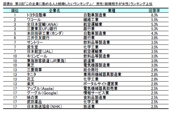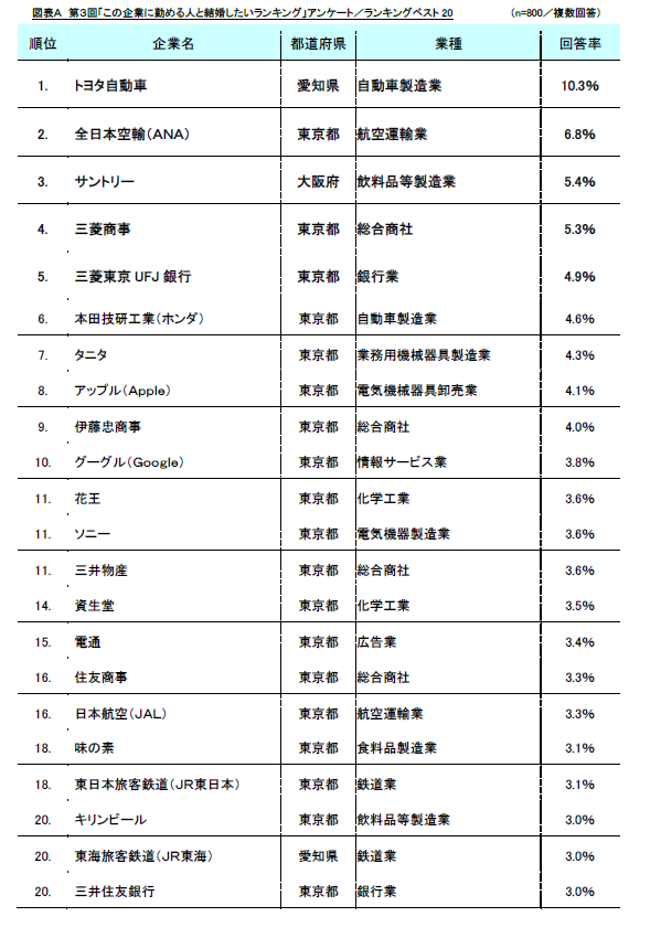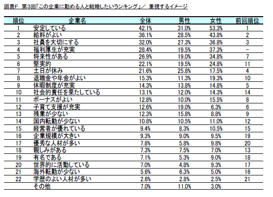 ・調査名称 : 第3回「この企業に勤める人と結婚したいランキング」
