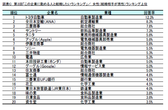 これに対して、女性が結婚相手の男性に望む勤務先としてのランキング1位は「トヨタ自動車」(回答率12.3%)となっております。次いで「全日本空輸(ANA)」が2位(同8.3%)、「三菱商事」が3位(同7.8%)となり、以下、4位「サントリー」(同7.3%)、5位「タニタ」(同5.8%)と続く結果となりました。(図表C)