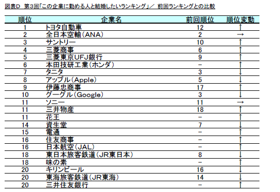 第2回「この企業に勤める人と結婚したいランキング」の結果と比較したところ、上位企業のうち「トヨタ自動車」(前回12位)、「サントリー」(前回10位)、「三菱商事」(前回6位)、「三菱東京UFJ銀行」(前回9位)など半数以上の13社が前回からランクアップしました。