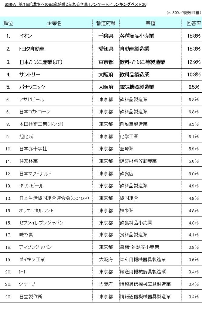 「環境への配慮が感じられる企業」アンケートのランキング1位は「イオン」(回答率15.8%)であった。次いで「トヨタ自動車」が2位(同15.3%)、「日本たばこ産業(JT)」が3位(同12.9%)となりました。以下「サントリー」(同10.3%)、「パナソニック」(同8.5%)、「アサヒビール」「日本コカ・コーラ」(同6.8%)と続いております。(図表A)