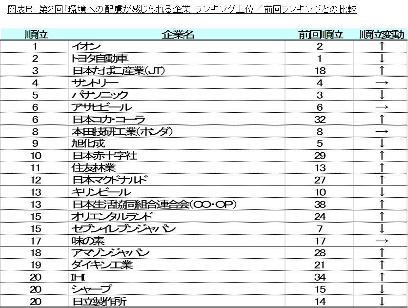 今回のランキング上位の多くは、第1回調査においても上位にランクインしている企業であり、それらの企業については、広く環境への配慮が認識されている企業であるといえます。