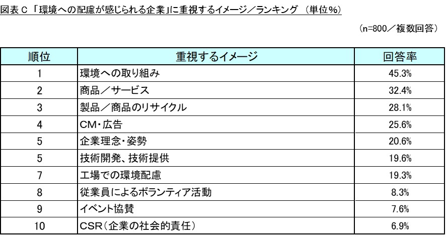 同時に「環境への配慮が感じられる企業」に重視するイメージを聞いたところ、「環境への取り組み」を挙げる回答が45.3%と最も多くなりました。次いで「商品/サービス」(回答率32.4%)、「製品/商品のリサイクル」(同28.1%)、「CM・広告」(同25.6%)、「企業理念・姿勢」(同20.6%)の順となっております。(図表C)