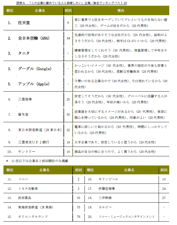 結婚相手の勤める企業で人気の総合ランキングのトップは「任天堂」、次いで「全日本空輸(ANA)」が2位、「タニタ」「グーグル(Google)」が同率で3位となっています。以下「アップル(Apple)」「三菱商事」「資生堂」と続いています。