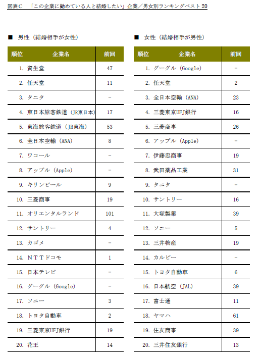 性別毎にベスト3を見てみると、男性が望む結婚相手が勤める企業として「資生堂」「任天堂」「タニタ」となり、女性が望む結婚相手が勤める企業としては「グーグル」「任天堂」「全日本空輸(ANA)」となりました。