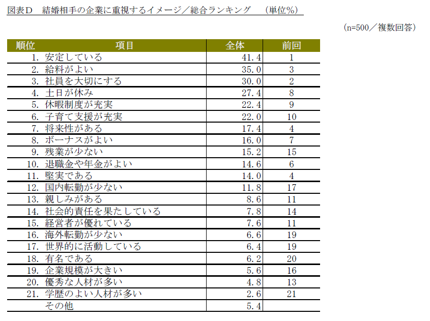 選択した理由を自由回答及び結婚相手の企業に重視するイメージ(図表D)で尋ねたところ、こちらは前回と同様に「安定している」「給与がよい」という回答が随所に見られる結果となりました。