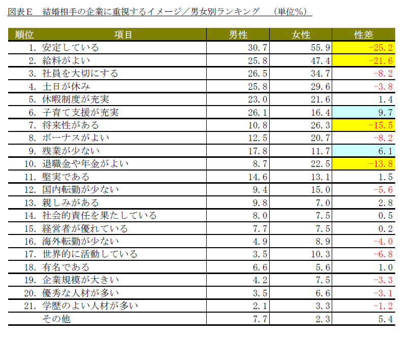 【結婚相手の勤める企業についての重視イメージのランキング】(図表D、図表E)