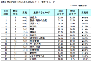 同時に「世界に誇れる日本企業」に重視するイメージの質問では、「技術力」を挙げる回答が62.0%と最も多く、次いで「製品・商品の品質」(回答率51.1%)、「世界シェア」(同36.2%)、「安定性」(同32.3%)と上位4項目については、前回と同順位となったことから、人々が企業を世界に誇れると感じる主な要因に、大きな変化は見られない結果となりました。(図表C)