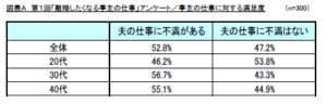調査対象者300名に聞いた「亭主の仕事に対する満足度」は、「不満がある」(回答率52.8%)が「不満はない」(同47.2%)を若干上回る結果となりました。