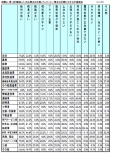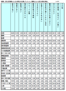 また、業種別にみると、建設業では、「残業が多い」(同7.1%)がきわめて低い回答率になっているものの、「休みが少ない」、「福利厚生が不十分」などで高い回答率となっていることから、現在の業界毎の景気動向や労働環境などを反映した結果とみることができます。