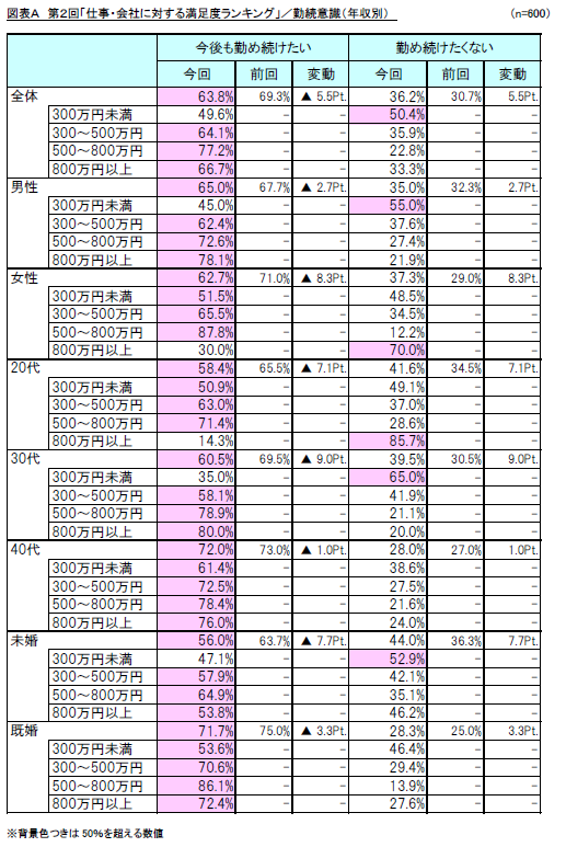 一方、20代や女性においては年収800万円以上の場合、勤続意欲が低下する結果となりました。業務の責任が伴うほどの高収入は、むしろ20代や女性にとって仕事の満足度を下げる要因となっているようです。(図表A)