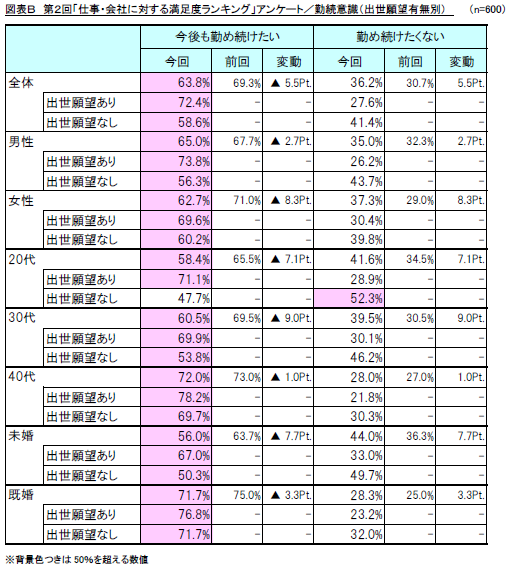 今回で第2回となります「仕事・会社に対する満足度」調査。今回も「今後も勤め続けたい」(回答率63.8%)が「勤め続けたくない」(同36.2%)を大きく上回る結果となりました。しかし、前回より「今後も勤め続けたい」が減少し、「勤め続けたくない」との差が5.5ポイント減少しました。
