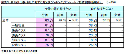 また、役職別に勤続意欲の調査では、高い役職に就いている方が勤続意欲も高まる傾向にとなった。(図表C)
