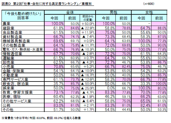 [3]勤続意欲の高い業種は、「農業」、「公務」、「教育、学習支援業」がTOP3!
