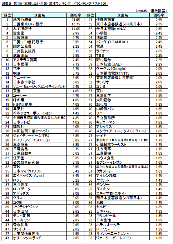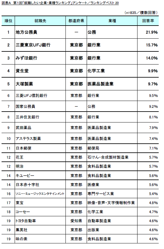 TOP20に入った業種では、公務員が1位(地方公務員)と7位(国家公務員)にランクインしたほか、銀行業が4社(三菱東京UFJ銀行、みずほ銀行、三菱UFJ信託銀行、三井住友銀行)と最も多く、次いで化学工業(資生堂、花王、コーセー)、医薬品製造業(大塚製薬、武田薬品、アステラス製薬)、食料品製造業(明治、キユーピー、味の素)が3社ずつランクインし、これらの4業種に人気が集中する結果となりました。