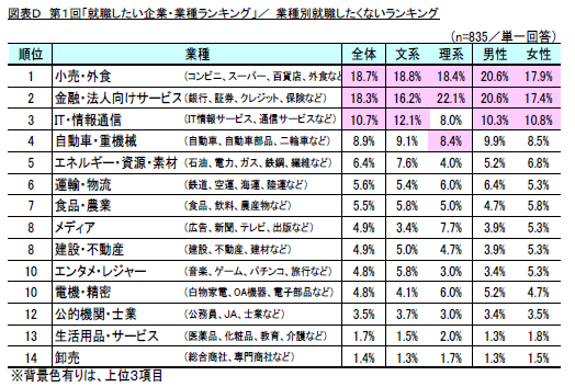 逆に、就職したくない業種では、1位が「小売・外食」、2位が「金融・法人向けサービス」、3位が「IT・情報通信」となっています。(図表D)