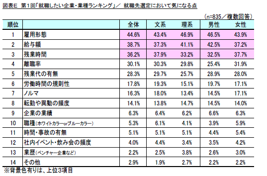 就職先の選定において気になる点では、「雇用形態」が1位、「給与額」が2位、「残業時間」が3位となりました。(図表E)