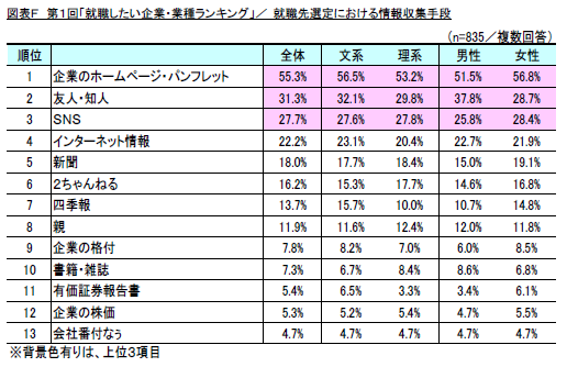 就職先の選定における情報収集手段としては、「企業のホームページ・パンフレット」が圧倒的に多く、次いで「友人・知人」、「SNS」、「インターネット情報」と続きました。(図表F)