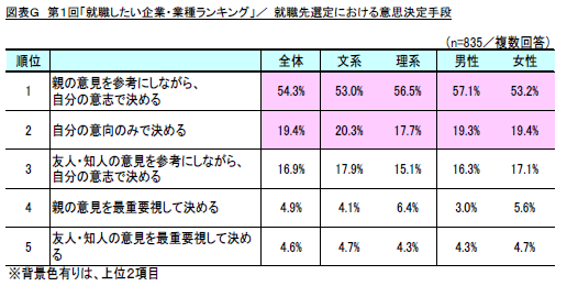 就職先を選定する際の意思決定手段については、「親の意見を参考にしながら、自分の意志で決める」が1位となり、次いで「自分の意向のみで決める」が2位、「友人・知人の意見を参考にしながら、自分の意志で決める」が3位となった。(図表G)