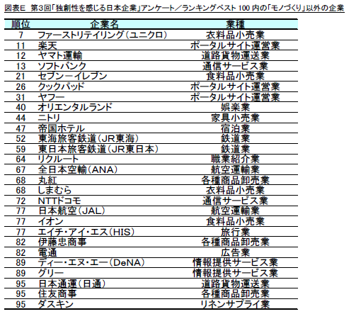 一方で、今回のランキング上位100社の約3割にあたる27社が「モノづくり」以外の企業となりました。(図表E)