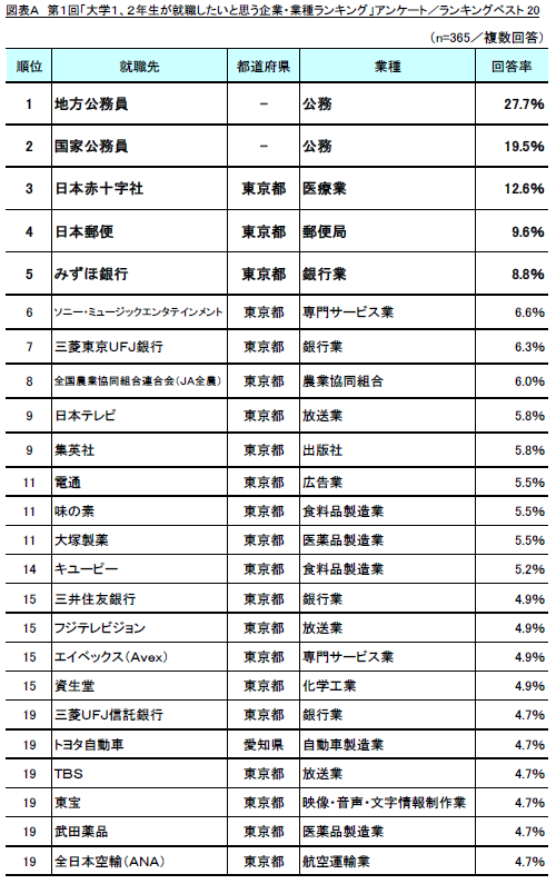 第1回「大学1、2年生が就職したいと思う企業・業種ランキング」調査