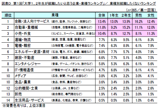 逆に、就職したくない業種についても同様にアンケートを行ったところ、1位が「金融・法人向けサービス」、2位が「自動車・重機械」、3位が「小売・外食」となっています。(図表D)