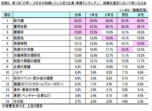 就職先の選定において気になる点では、「給与額」が1位、「雇用形態」が2位、「離職率」が3位となりました。学年別に見ると「雇用形態」、「勤務地」、「残業時間」、「残業代の有無」、「企業の業績」といった項目について、1年生よりも2年生の方が大幅に高い回答率となっており、就職について、より具体的に意識されていることがうかがえます。(図表E)