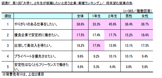 将来望む就業の形としては、「やりがいのある仕事をしたい」が1位、次いで「優良企業で安定的に働きたい」、「出世して高収入を得たい」と続きました。学年別では、1年生よりも2年生の方が、「やりがいのある仕事をしたい」という意向が強く、「出世して高収入を得たい」という意向は弱くなる傾向が見受けられます。(図表F)