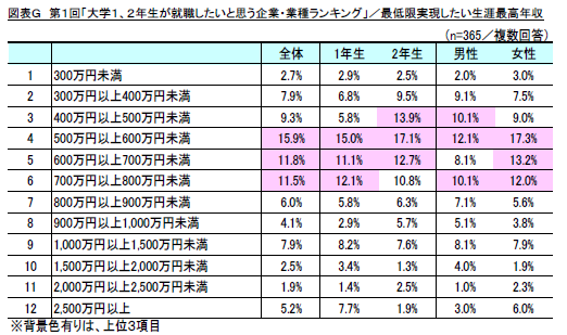 また、就職先において最低限実現したい生涯最高年収としては、「500万円以上600万円未満」が最も多く、「600万円以上700万円未満」が2位、「700万年以上800万円未満」が3位となりました。学年別では1年生よりも2年生の方が希望する生涯年収が低い傾向にあることがうかがえます。(図表G)