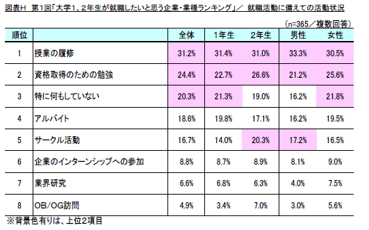 さらに、これらの志向に対して、大学1、2年生として、就職活動に備えて取り組んでいることを確認したところ、「特に何もしていない」という回答が3位にランクインしたものの、「授業の履修」が1位、続いて「資格取得のための勉強」となり、学生の本分である勉学に勤しむことが就職活動においても役立つと考えている学生が多く、中でも2年生においては、資格取得を目指す割合が高まっていることが分かる結果となりました。(図表H)