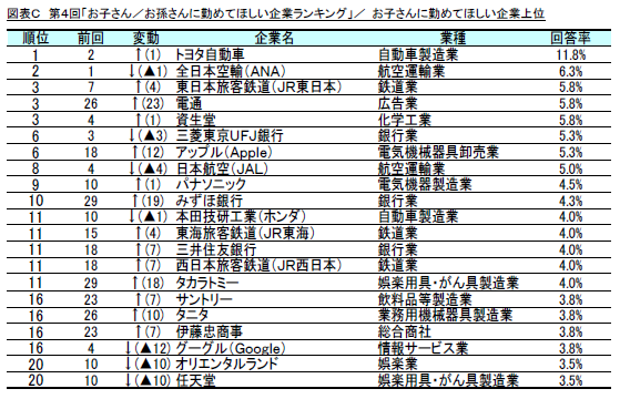 なお、お子さんに勤めてほしい企業においては、上位20社全てのランキングが入れ替わっております。「アップル(Apple)」、「グーグル(Google)」などのIT関連企業を初めとした新興企業がランクインするなど、経済の流行に敏感な父母世代の感性を反映している様子がうかがえます。