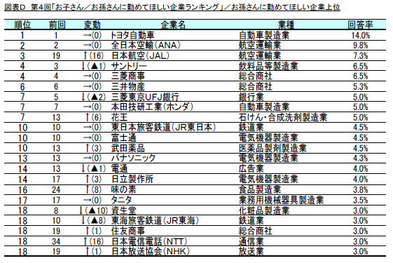 第4回の「お子さん/お孫さんに勤めてほしい企業ランキング」の1位は「トヨタ自動車」となりました。次いで「全日本空輸(ANA)」が2位、「日本航空(JAL)」が3位となりました。以下、同率4位「サントリー」、「東日本旅客鉄道(JR東日本)」、「三菱東京UFJ銀行」、7位「電通」、8位「三菱商事)」、9位「本田技研工業(ホンダ)」、同率10位「資生堂」、「パナソニック」と続きました。(図表A)