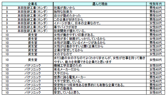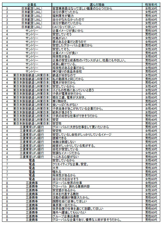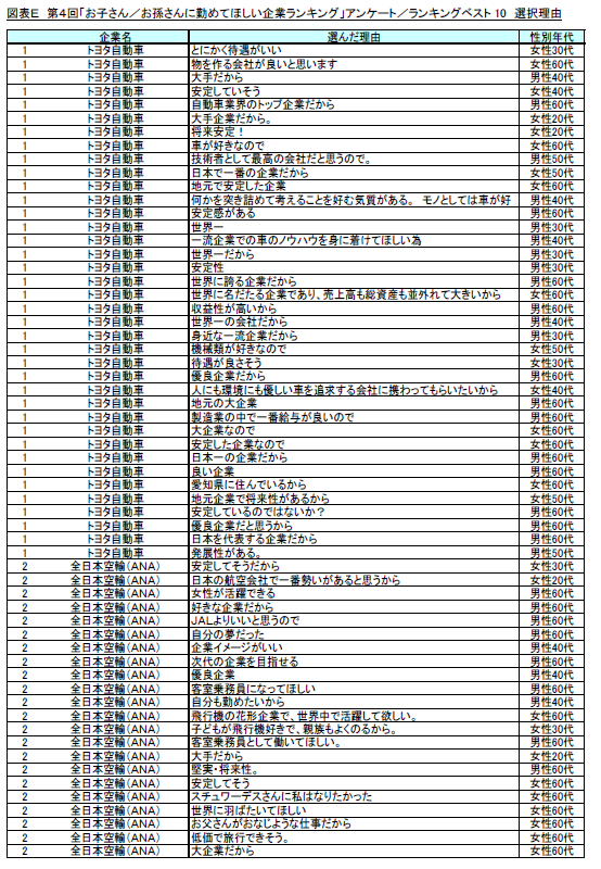 選択した理由を自由回答で尋ねたところ、1位の「トヨタ自動車」では、「安定している」「世界的な大企業」といった意見が大多数を占めています。2位の「全日本空輸(ANA)」では、「国際的である」、「企業イメージが良い」といった意見、3位の「日本航空(JAL)」では、「自分が勤めていた」、「自分が勤めたかった」などの意見がそれぞれに見られました。全体でも、「安定している」「業務内容が国際的である」といった回答が多く、「自分と同じ職業を」、「自分の夢を子・孫に託す」という回答も多く見られました。(図表E)