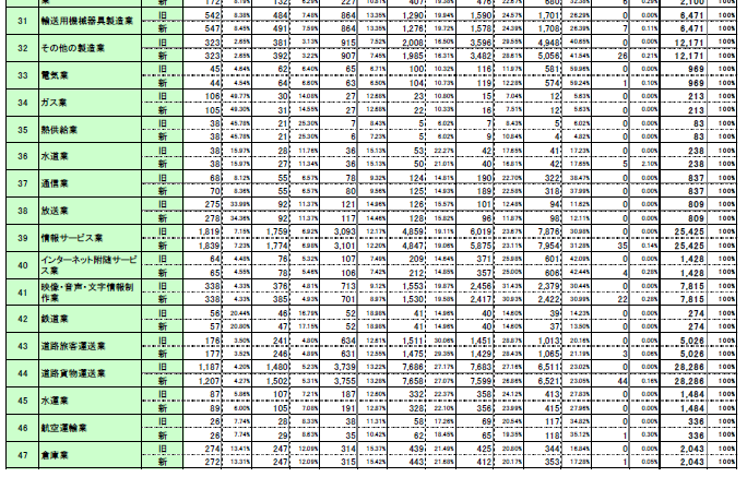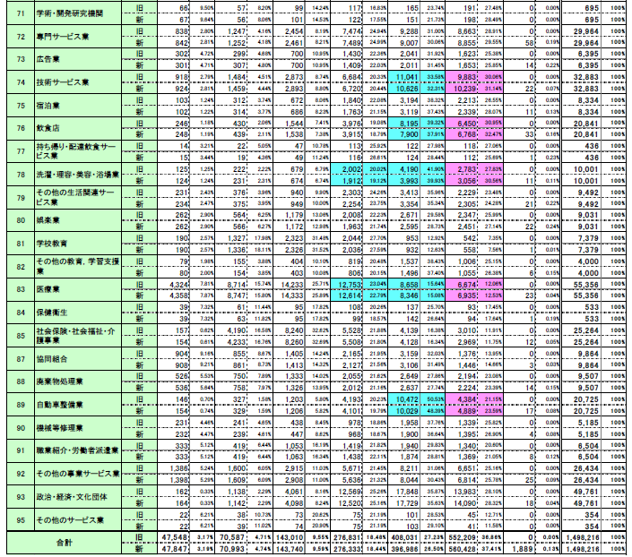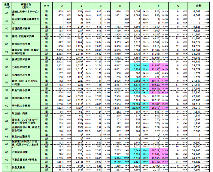 業種ごとの格付遷移状況では、農業、印刷・同関連業、その他の卸売業、織物・衣服・身の回り品小売業、飲食料品小売業、その他の小売業、不動産取引業、不動産賃貸業・管理業、技術サービス業、飲食店、洗濯・理容・美容・浴場業、医療業、自動車整備業などでF格が増加、格下げ傾向となりました。