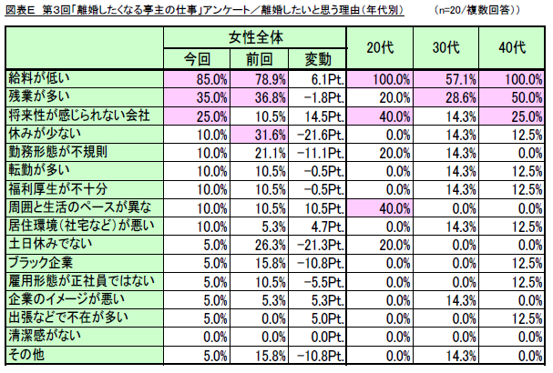年代別に見ると、「給料が低い」については、全ての年代において最も高い回答率となっていますが、「残業が多い」については、20代から40代へと年代が高まるにつれて回答率も高くなっており、[2]の「夫の仕事に対する不満理由」と逆の傾向にあることがわかります。(図表E)