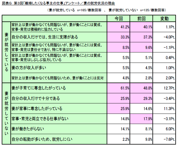 また今回の調査結果において、半数以上の家庭で妻も就労する「共働き」という結果となりましたが、夫の仕事に対する不満理由に反して、妻の就労理由は、経済的な理由というよりも妻自身が外で働きたいのか、家事や育児に専念したいのかという妻の志向によるものが多い結果となりました。