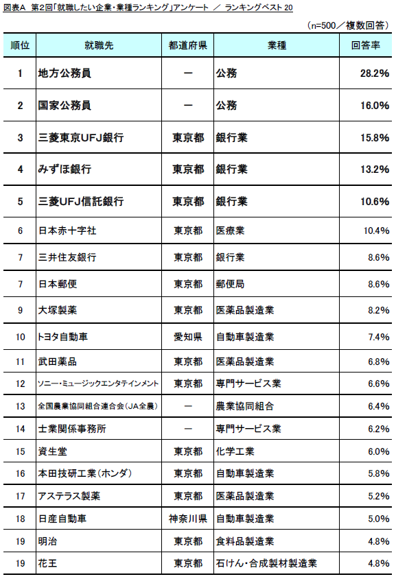 業種では、公務員が1位(地方公務員)と2位(国家公務員)を独占したほか、銀行業が4社(三菱東京UFJ銀行、みずほ銀行、三菱UFJ信託銀行、三井住友銀行)と最も多く、次いで、医薬品製造業(大塚製薬、武田薬品、アステラス製薬)が3社ランクインし、この3業種が人気の業種となりました。