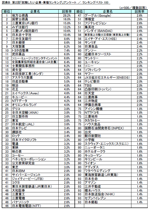 ・調査名称 : 第2回「就職したい企業・業種ランキング」調査