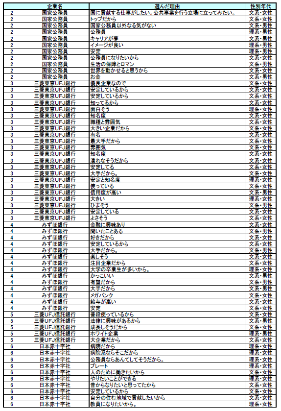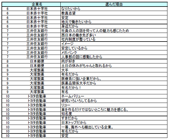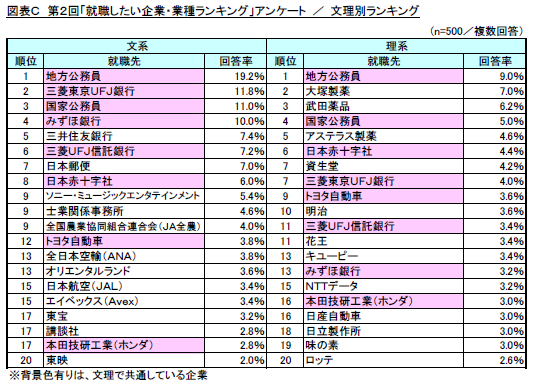 本アンケートでは、昨年に引き続き安定職の代名詞とも言える「公務員」や「大手銀行」の人気が高く、「自らが一生涯にわたり安定した生活を送るための職場」を学生達は求めており、「公務員」や「大手銀行」以外でも、理系の学生を中心に、「製薬会社」等のように「自らが学んできた学術を一生涯活かすための職場」が希望していることがうかがえる結果となりました。