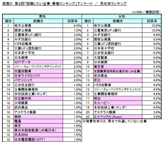 一方、女性が望む就職先のランキング1位は「地方公務員」(回答率18.8%)となり、次いで「三菱東京UFJ銀行」(同12.0%)が2位、「みずほ銀行」が3位(同9.6%)、「国家公務員」(同8.8%)が4位、「三菱UFJ信託銀行」(同8.0%)が5位と続きました。(図表D)