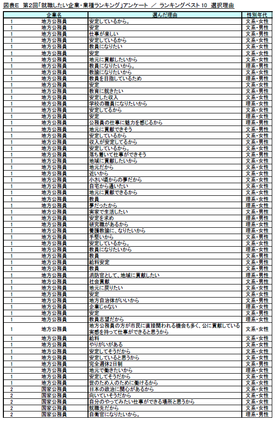 ランキング上位企業における選択理由の多くが、企業・組織の規模や知名度を背景とした安定性を理由に挙げており、学業との関連性や商品・サービスへの愛着など業務内容を理由する意見は、比較的少数派となりました。(図表E)