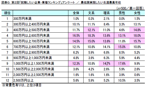 さらに、上記で1位となった「給与額」について、最低限実現したい生涯最高年収を調査したところ、「500万円以上600万円未満」(16.5%)が最も多く、「600万円以上700万円未満」が2位、「1,000万円以上1,500万円未満」が3位となりました。特に理系の男性においては、高い年収を望む傾向がうかがえる結果となりました。(図表G)