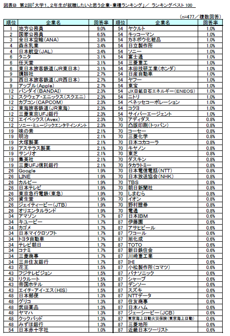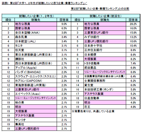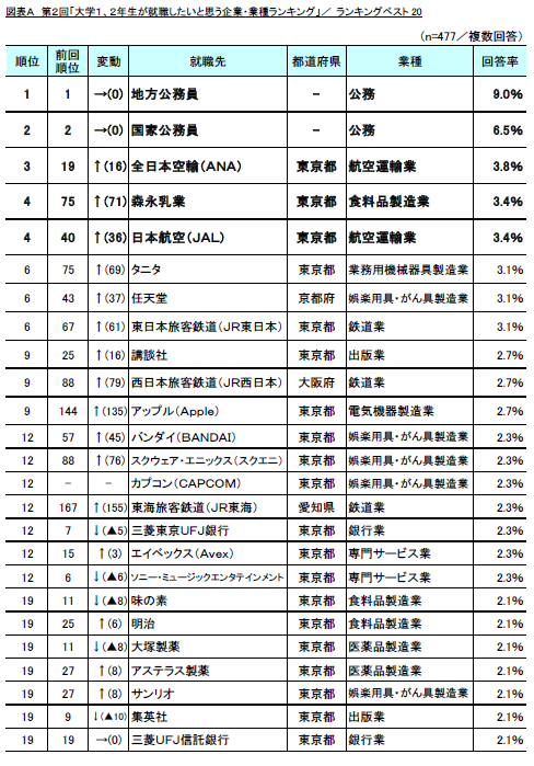 前回調査結果と比較では、公務員のTOP2に変化はなく、「全日本空輸(ANA)」(前回19位→今回3位)、「日本航空」(前回40位→今回4位)の航空運輸業2社や、「任天堂」(前回43位→今回6位)、「バンダイ(BANDAI)」(前回57位→今回12位)などの娯楽用具・がん具製造業5社が大幅に順位を上げる結果となりました。
