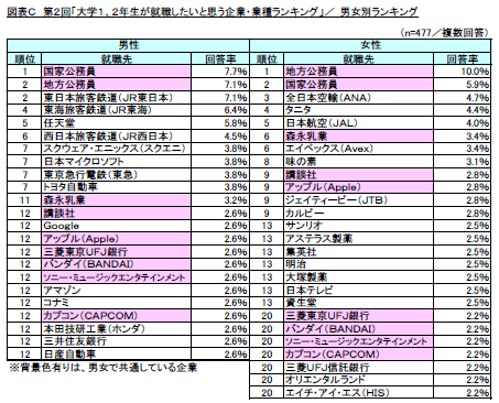 一方、女性が望む就職先のランキング1位は「地方公務員」(回答率10.0%)となり、次いで「国家公務員」(同5.9%)が2位、「全日本空輸(ANA)」(同4.7%)が3位、「タニタ」(同4.4%)が4位、「日本航空(JAL)」(同4.0%)が5位と続きました。(図表C)