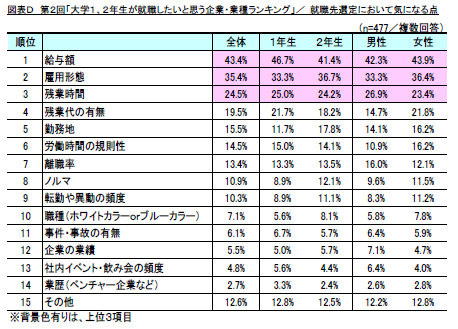 就職先の選定において気になる点では、「給与額」(回答率43.4%)が1位、「雇用形態」(同35.4%)が2位、「残業時間」(同24.5%)が3位となり、学年別、男女別においても同様の結果となりました。(図表D)