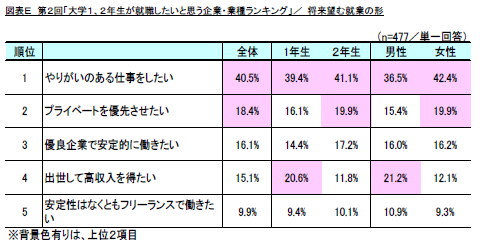 将来望む就業の形としては、「やりがいのある仕事をしたい」(同40.5%)が1位、次いで「プライベートを優先させたい」(同18.4%)、「優良企業で安定的に働きたい」(同16.1%)と続きました。学年別では、1年生よりも2年生の方が、「やりがいのある仕事をしたい」という意向が強く、「出世して高収入を得たい」という意向は弱くなる傾向が見受けられます。(図表E)