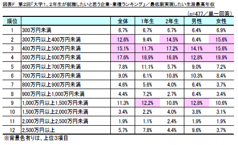 また、就職先において最低限実現したい生涯最高年収としては、「500万円以上600万円未満」(同17.6%)が最も多く、「400万円以上500万円未満」(同15.1%)が2位、「300万年以上400万円未満」(同12.6%)が3位となった。学年別では1年生よりも2年生の方が希望する生涯年収が低い傾向にあることがうかがえます。(図表F)