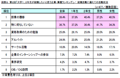 さらに、これらの志向に対して、大学1、2年生として、就職活動に備えて取り組んでいることを確認したところ、「授業の履修」(同39.4%)が1位、「特に何もしていない」(同36.7%)が2位、「資格取得のための勉強」(同25.8%)が3位となり、既に就職活動の準備を行っている学生が延べ6割以上いるのに対して、4割弱の学生がまだ就職活動に対して意識が低いという結果となりました。(図表G)
